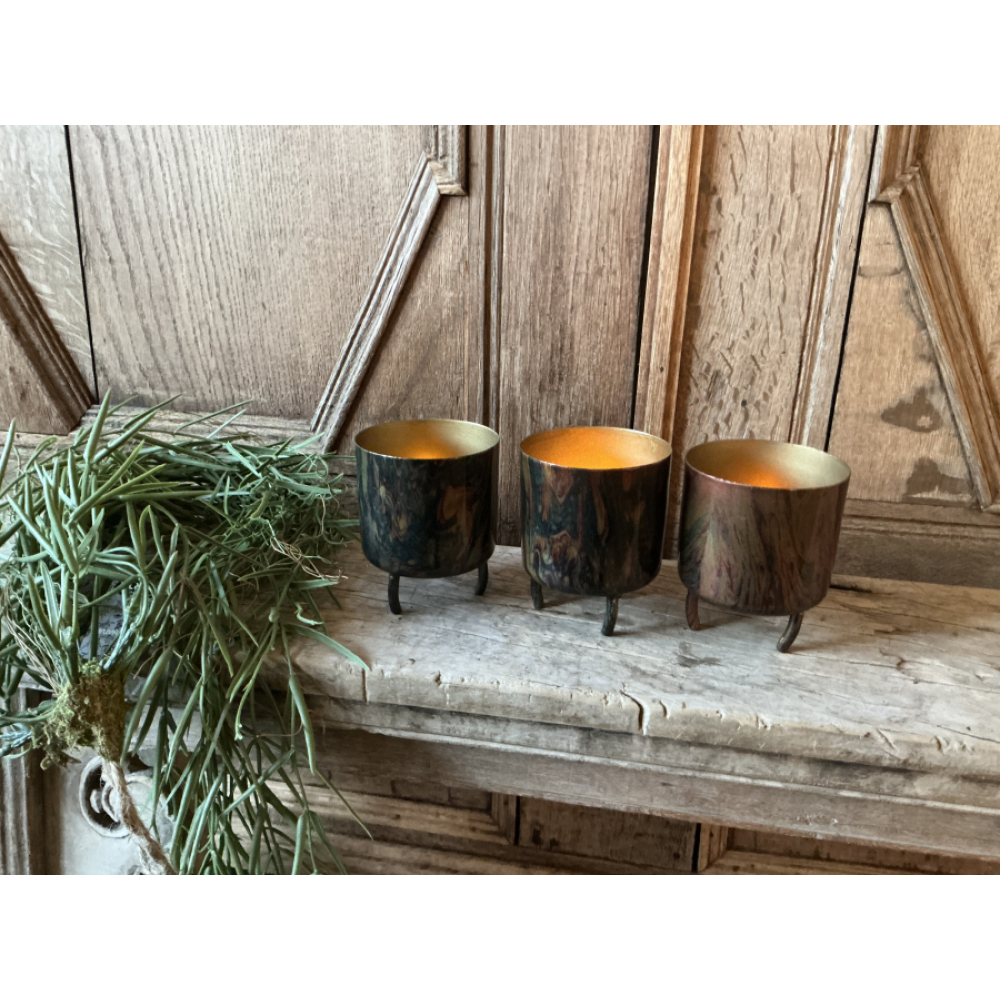 Leuke set van 3 metalen windlichtjes op 3 pootjes.
