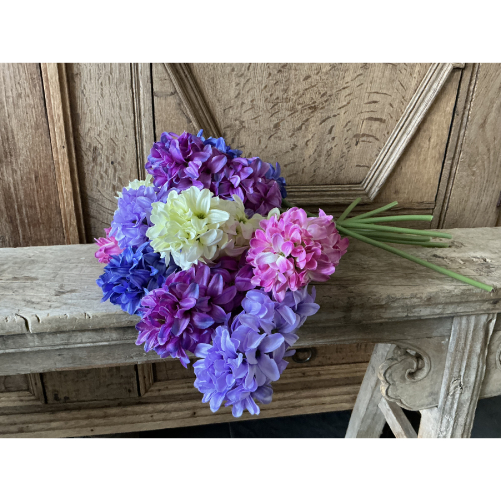 In het boeket zitten 10 hyacinten in verschillende kleuren van 40 cm lang.