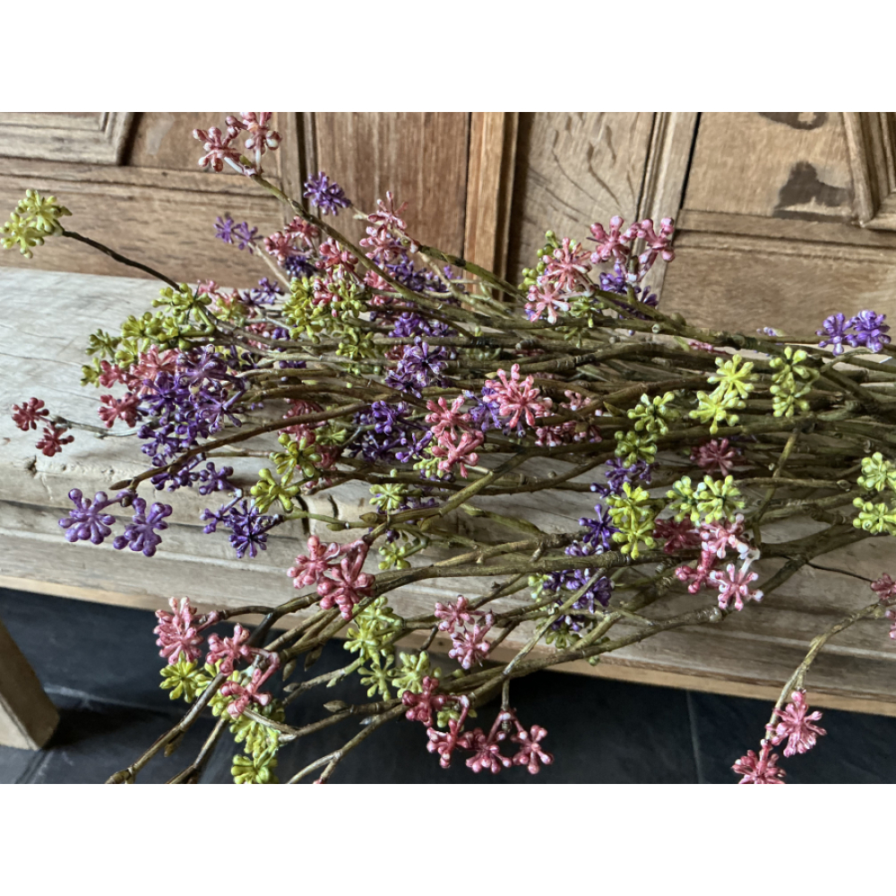In het boeket zitten 3 groen, 3 paarse en 3 burgundy kleurige rijstbloemen van 56 cm lang