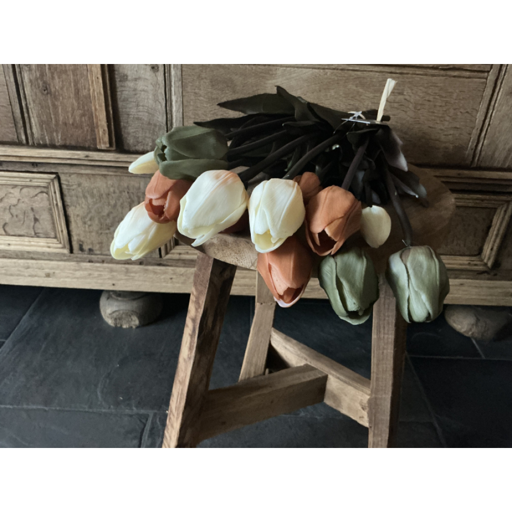 In deze bos zitten maar liefst 15 tulpen, waarvan er 6 in knop en 9 bloeiend.in de kleuen terra, creme en groen