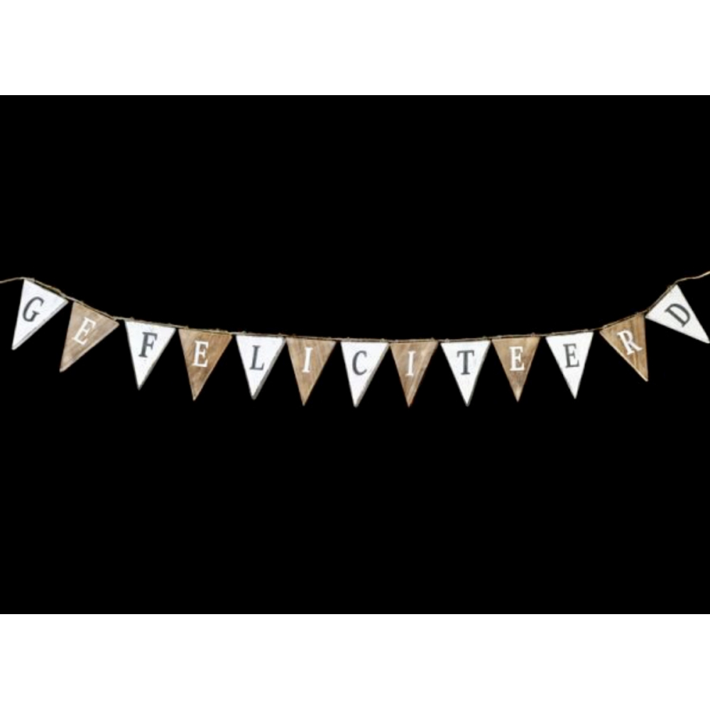 Leuke houten vlaggetjes slinger met "gefeliciteerd" erop.