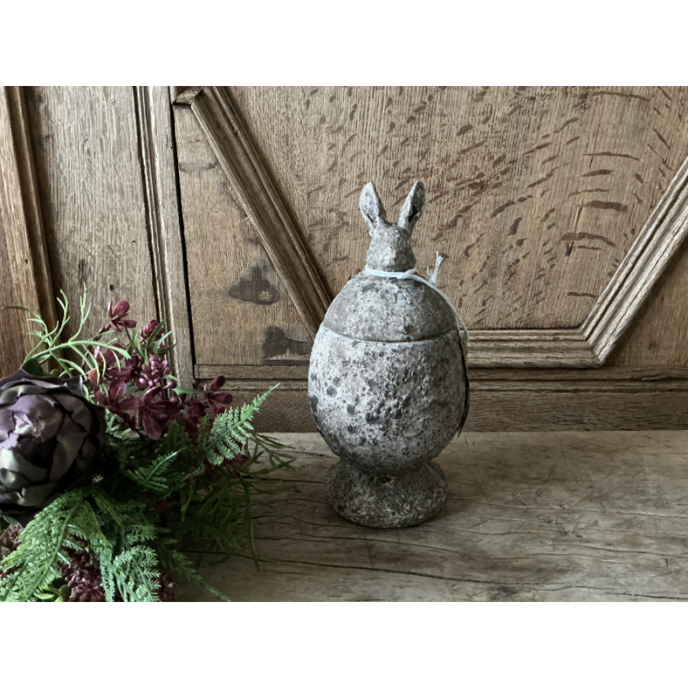 Hij is in de vorm van een ei met bovenop een hazen/konijnen hoofdje.