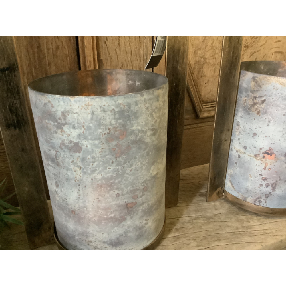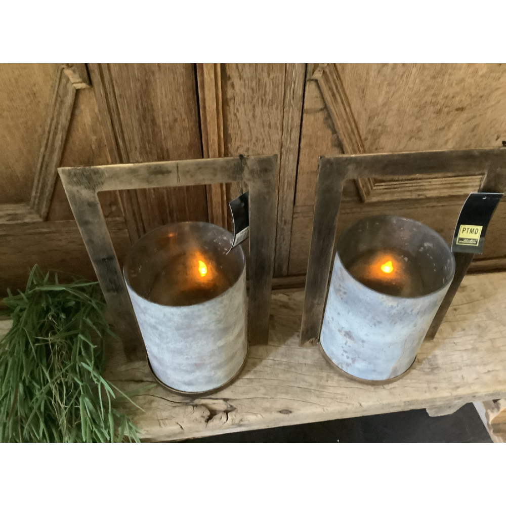 Het is een metalen houder met een glazen windlicht, welke eruit kan worden gehaald.