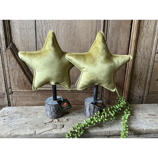 Het zijn goudkleurige sterren van glans velours stof op een houten voet.